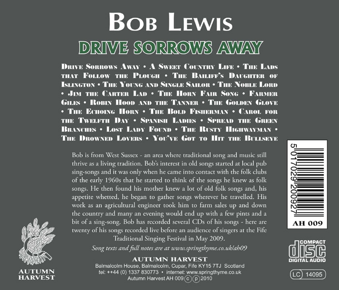 Bob Lewis grew up in Heyshott in West Sussex, an area that is renowned as an area where English traditional song and music still thrives as a living tradition. In May 2009 Bob was a guest at the Fife Traditional Singing Festival where he sang a great selection of songs. Here are twenty of his songs that were recorded during the weekend - many with singers in the audience joining him on choruses. Songs include the title song Drive Sorrows Away, a lyrical Spread the Green Branches and a southern English hunting song The Echoing Horn.